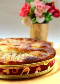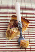 całe ciasto marmuru na statywie z płyty i śmietaną, przodu i boku, białym tle przestrzeni reklamowej kopii