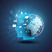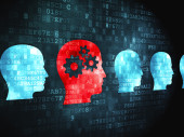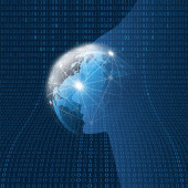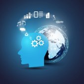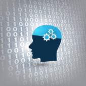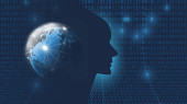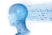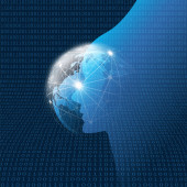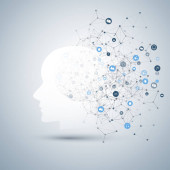 Nowoczesny styl futurystycznej i uczenia głębokiego, sztuczna inteligencja koncepcja 3d tło wzorzyste cyfrowych bitów i ludzkiej głowy