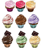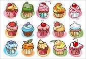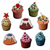 Zestaw babeczki linię narysowaną na białym tle. Kolorowe ciastka z kremem. Szkic wektor