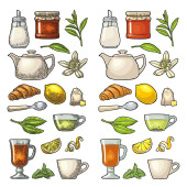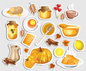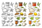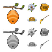Jogurt w słoiku. Szklane kubki herbaty. Łyżki. Miodu, plaster miodu i pszczoły. Szkic linii posiłek na białym tle.
