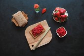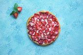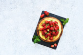 Ciasto z truskawkami na stół czarny posypane mąką.