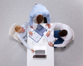 Zdjęcie "Dwóch biznesmenów siedzi przy biurku z laptopa. Widok z góry" może być wykorzystywane do celów osobistych i komercyjnych zgodnie z warunkami zakupionej licencji Royalty-free. Obraz jest dostępny do pobrania w jakości wysokiej rozdzielczości do 5760x3840.