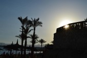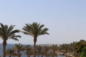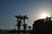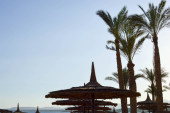 Truskawka przeciwsłonecznych lato parasole wykonane z siana, słomy w kształcie czapki na tle szczyty drzew palmowych i kopiowanie miejsca na wielkie słońce zachód słońca.