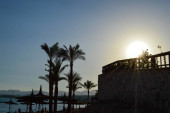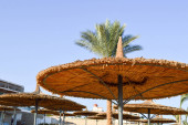 Zdjęcie "Truskawka przeciwsłonecznych lato parasole wykonane z siana, słomy w kształcie czapki na tle szczyty drzew palmowych i kopiowanie miejsca na wielkie słońce zachód słońca." może być wykorzystywane do celów osobistych i komercyjnych zgodnie z warunkami zakupionej licencji Royalty-free. Obraz jest dostępny do pobrania w jakości wysokiej rozdzielczości do 5760x3840.