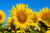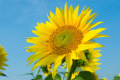 Żółte słoneczniki rosną na polu. Uprawy rolne.