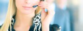 Młoda piękna kobieta trzyma w ręku pędzli do makijażu .