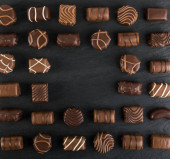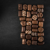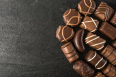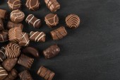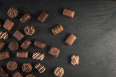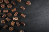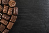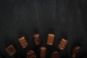 Piękne kreatywne czekoladowych słodkości na naturalne czarne tło kamienia. Mieszanka czekoladek, widok z góry i z płaskim laikiem z miejscem dla tekstu