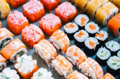 Urządzone bez wyżywienia stole bankietowym z różnych sushi i nigiri sushi płyta asortyment na części