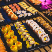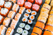 Zdjęcie "Urządzone bez wyżywienia stole bankietowym z różnych sushi i nigiri sushi płyta asortyment na części" może być wykorzystywane do celów osobistych i komercyjnych zgodnie z warunkami zakupionej licencji Royalty-free. Obraz jest dostępny do pobrania w jakości wysokiej rozdzielczości do 5760x3840.