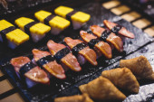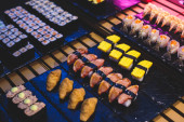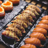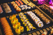 Zdjęcie "Urządzone bez wyżywienia stole bankietowym z różnych sushi i nigiri sushi płyta asortyment na części" może być wykorzystywane do celów osobistych i komercyjnych zgodnie z warunkami zakupionej licencji Royalty-free. Obraz jest dostępny do pobrania w jakości wysokiej rozdzielczości do 5760x3840.