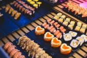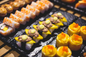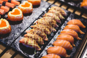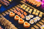 Urządzone bez wyżywienia stole bankietowym z różnych sushi i nigiri sushi płyta asortyment na części