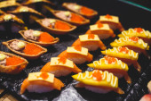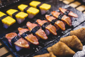 Urządzone bez wyżywienia stole bankietowym z różnych sushi i nigiri sushi płyta asortyment na części