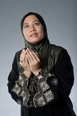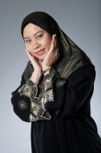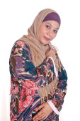 piękna i pewna siebie kobieta muzułmańska w szalik, na białym tle.