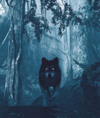 Horror widok wielki niedźwiedź w lesie w nocy. Wściekły niedźwiedź za zachmurzone niebo ogień. Sylwetka niedźwiedzia w ciemnym tle Mglisty las