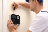 Technika instalacja kamery Cctv na ścianie w pomieszczeniu