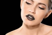 Piękny model młody z srebrne usta makijaż na białym tle