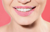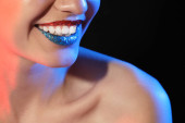 Piękny model młody z makijażem srebrne usta na czarnym tle