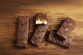 Piękne kreatywne prezenty czekoladowe na tle naturalny drewniany stół. Linia z góry czekoladki z miejscem dla tekstu