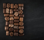 Piękne kreatywne prezenty czekoladowe na tle naturalny drewniany stół. Kwadratowa ramka z góry czekoladki z miejscem dla tekstu