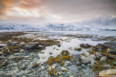 Typowo norweskim wybrzeżu ze skał w czasie odpływu na fiord w gminie Troms Norwegia. Słońce jest nisko nad horyzontem, niebo zachmurzone. Góry pokryte są śniegiem zimą zimno.