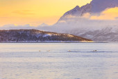Zdjęcie "Typowo norweskim wybrzeżu ze skał w czasie odpływu na fiord w gminie Troms Norwegia. Słońce jest nisko nad horyzontem, niebo zachmurzone. Góry pokryte są śniegiem zimą zimno." może być wykorzystywane do celów osobistych i komercyjnych zgodnie z warunkami zakupionej licencji Royalty-free. Obraz jest dostępny do pobrania w jakości wysokiej rozdzielczości do 5760x3840.