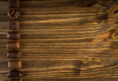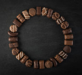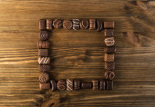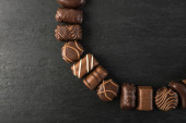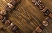 Piękne kreatywne prezenty czekoladowe na tle naturalny drewniany stół. Linia z góry czekoladki z miejscem dla tekstu