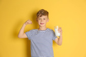 Mały chłopiec z szklankę mleka na kolor tła