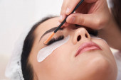 Młoda kobieta przechodzi rzęs rozszerzenie procedury, zbliżenie