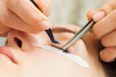 Młoda kobieta przechodzi rzęs rozszerzenie procedury, zbliżenie