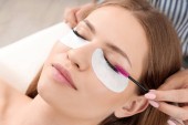 Młoda kobieta przechodzi rzęs rozszerzenie procedury, zbliżenie