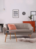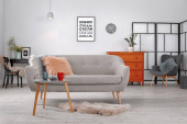 Zdjęcie "Wnętrz pokój dzienny z rozkładaną sofą" może być wykorzystywane do celów osobistych i komercyjnych zgodnie z warunkami zakupionej licencji Royalty-free. Obraz jest dostępny do pobrania w jakości wysokiej rozdzielczości do 5760x3840.