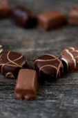 Piękne kreatywne czekoladowych słodkości na naturalne czarne tło kamienia. Widok z góry czekoladki i płaskim leżał z miejscem dla tekstu