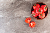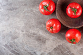 Płyty z świeżych dojrzałych pomidorów na szarym tle, widok z góry