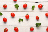 Zdjęcie "Mieszkanie świeckich skład z dojrzałe pomidory na podłoże drewniane" może być wykorzystywane do celów osobistych i komercyjnych zgodnie z warunkami zakupionej licencji Royalty-free. Obraz jest dostępny do pobrania w jakości wysokiej rozdzielczości do 5760x3840.