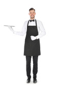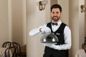 Przystojny kelner metalowa taca z pokrywą na jasnym tle