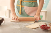 Kobieta, walcowania ciasta przy stole z wewnątrz, zbliżenie