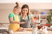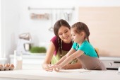 Matka i jej córka, przygotowanie ciasta przy stole w kuchni
