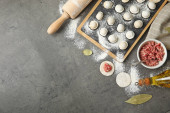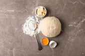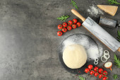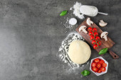 Ciasta i składniki na pizzy na tabela, widok z góry