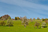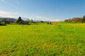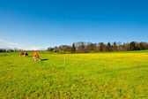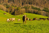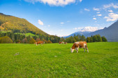 Krowy pasące się na pastwiskach świeże zielone góry na tle ośnieżonych Alp. Hodowla zwierząt w Szwajcarii, pola i łąki. Wieś zajmuje się produkcją mleka.