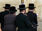 Jerozolimy Izrael 17 maja 2018 niewiadomych ludzi modlących się przedniej ścianie płaczu starego miasta w Jerozolimie w godzinach wieczornych