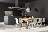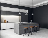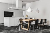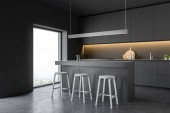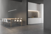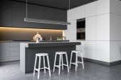 Rogu kuchni szary i biały ściany białe blaty, bar Stołki i ramy pionowy plakat na ścianie. makiety 3D renderowania