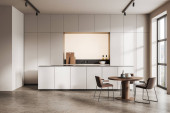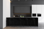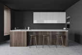 Zdjęcie "Rogu kuchni szary i biały ściany białe blaty, bar Stołki i ramy pionowy plakat na ścianie. makiety 3D renderowania" może być wykorzystywane do celów osobistych i komercyjnych zgodnie z warunkami zakupionej licencji Royalty-free. Obraz jest dostępny do pobrania w jakości wysokiej rozdzielczości do 5760x3840.