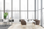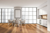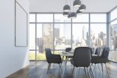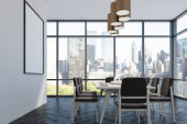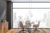 Nowoczesnej jadalni wnętrza z betonu podłogi, długi czarny stół z krzesłami beżowy i blaty. renderowania 3D