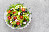 Sałatka grecka. Sałatką ze świeżych warzyw z serem pomidor, cebula, ogórki, papryka, oliwki, sałata i feta. Sałatka grecka na talerzu