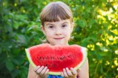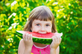 Zdjęcie "Dziecko je arbuza. Selektywny fokus." może być wykorzystywane do celów osobistych i komercyjnych zgodnie z warunkami zakupionej licencji Royalty-free. Obraz jest dostępny do pobrania w jakości wysokiej rozdzielczości do 5760x3840.
