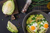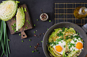 Jajka smażone z plastrami z młodej kapusty i zieleni. Pożywne śniadanie. Widok z góry.