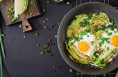 Zdjęcie "Jajka smażone z plastrami z młodej kapusty i zieleni. Pożywne śniadanie. Widok z góry." może być wykorzystywane do celów osobistych i komercyjnych zgodnie z warunkami zakupionej licencji Royalty-free. Obraz jest dostępny do pobrania w jakości wysokiej rozdzielczości do 5760x3840.