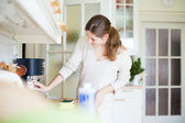 atrakcyjny blond kobieta trzyma łyżkę i miska podczas przygotowywania deserów w kuchni