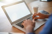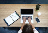 Widok górnej człowieka działa na laptopie w coffee shop