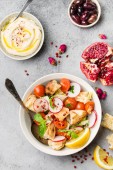 Zdjęcie "Bliski Wschód/arabski potraw i meze, betonowe podłoże rustykalny. Fattoush chleb tabbouleh, hummus, oliwki, pita, Sałatka, granat. Halal żywności. Specjały kuchni libańskiej. Kolacja i Bliskiego Wschodu. Widok z góry" może być wykorzystywane do celów osobistych i komercyjnych zgodnie z warunkami zakupionej licencji Royalty-free. Obraz jest dostępny do pobrania w jakości wysokiej rozdzielczości do 5760x3840.